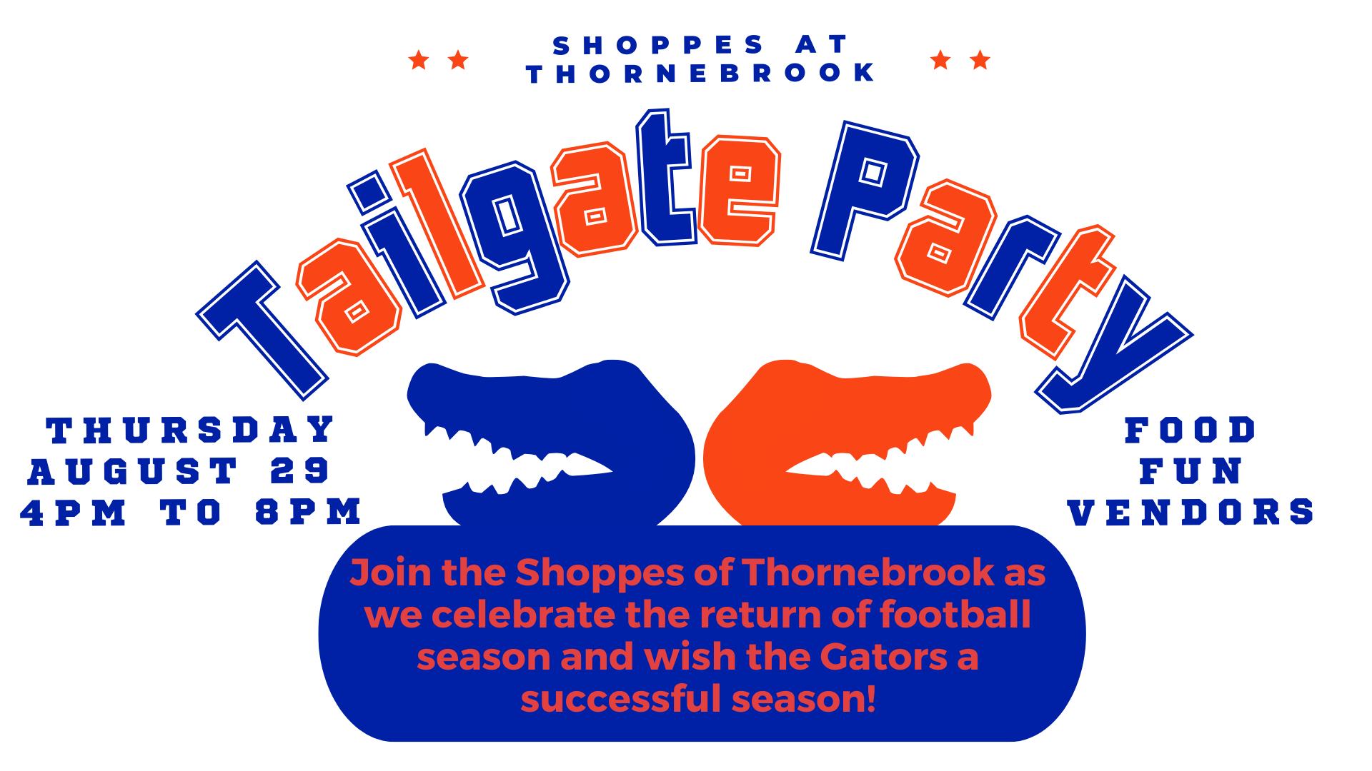 Thornebrook's Tailgate Party on Thursday, August 29, 2024 from 4pm to 8pm. Fun for the whole family at the Shoppes at Thornebrook! Join us to celebrate the return of football ...
